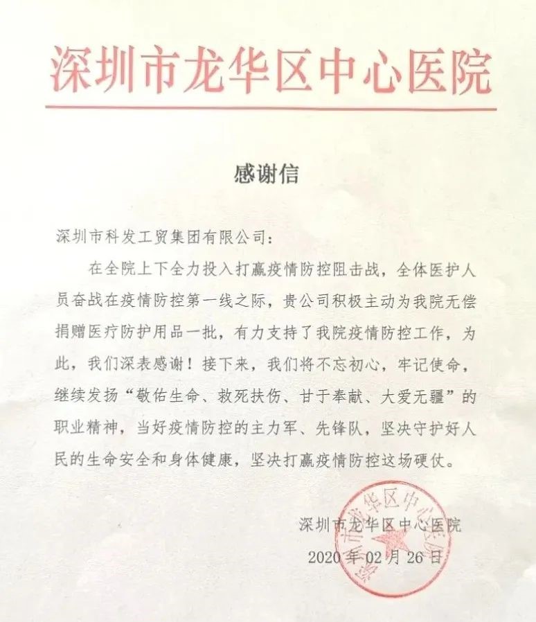 科發(fā)集團向新田社區(qū)捐贈愛心善款,并委托新田社區(qū)緊急采購了一批醫(yī)療物資,于2020年2月26日送達龍華區(qū)中心醫(yī)院,為戰(zhàn)斗在一線的白衣戰(zhàn)士們助力。