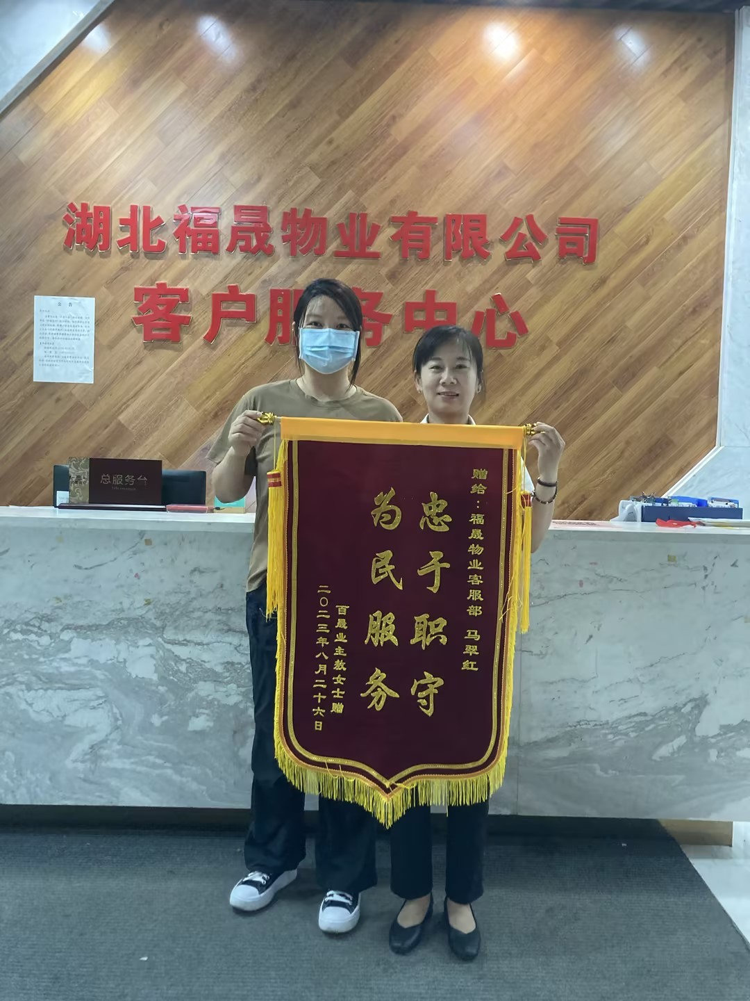一面錦旗,一聲好評(píng),一份滿意,是對(duì)物業(yè)服務(wù)工作人員的最大“褒獎(jiǎng)”,每一面錦旗都記錄著感動(dòng)與溫暖,每一次感謝都承載著認(rèn)可與肯定。8月27日,湖北福晟物業(yè)中心先后走進(jìn)了這樣的兩位業(yè)主,4-2-3002和13-2-1303的業(yè)主心存感恩之意,各自帶著錦旗來(lái)到物業(yè)服務(wù)中心,贈(zèng)予樓管家魏坤珍和馬翠紅。