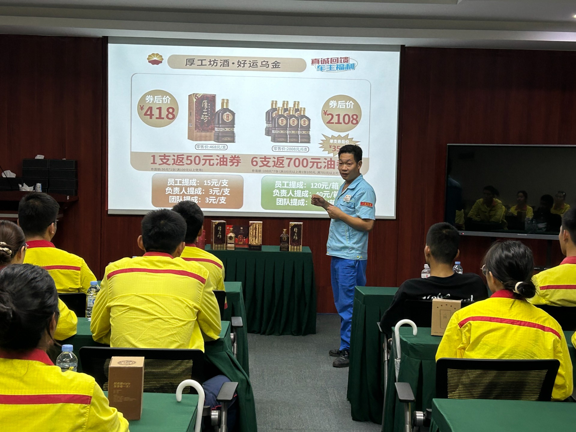近日,為了調(diào)動員工促銷積極性,提升便利店銷量,更好促進(jìn)油非互動,非油品部新增自營酒類禮包銷售。11月2日,非油品部組織友潤全體員工到友之源會議室,開展厚工坊酒類產(chǎn)品銷售培訓(xùn)會。此次共上新三款酒,非油品部胥輝云經(jīng)理對每一款酒的特點、賣點以及員工促銷提成方面進(jìn)行了逐一宣講。片區(qū)負(fù)責(zé)人侯永平在會議中講解開展禮包促銷活動的原因和開展禮包促銷的方法,提升員工促銷的主動性。