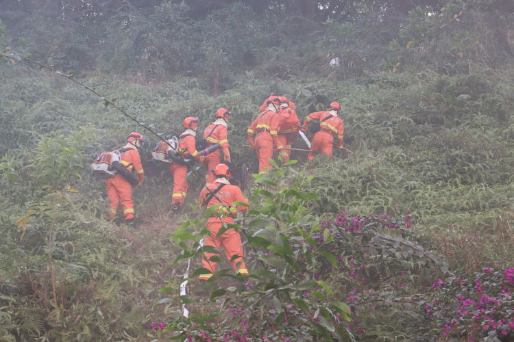 社區(qū)義務(wù)消防隊向觀瀾消防救援站指戰(zhàn)員匯報情況并移交火情現(xiàn)場指揮權(quán),得知1名受傷人員已送往救護點,仍有1名人員失蹤,并且發(fā)現(xiàn)山林火情可能危及山林另一側(cè)中國石化加油站的安全。