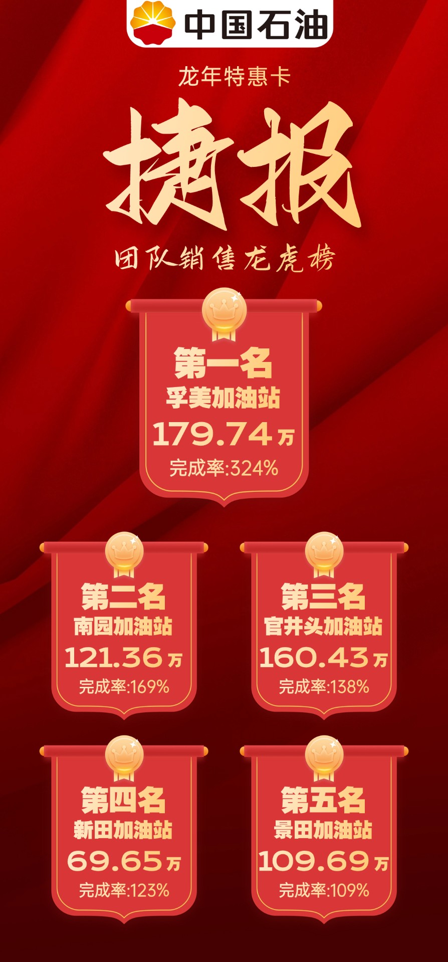 1月1日至31日,零售事業(yè)部開(kāi)展了油非互動(dòng)龍年特惠卡銷(xiāo)售比武活動(dòng),各油站高度重視此次銷(xiāo)售比武活動(dòng),全體員工銷(xiāo)售熱情高漲。在各油站員工的積極努力下,比武活動(dòng)共完成了1332.77萬(wàn)元的銷(xiāo)售業(yè)績(jī)。其中,孚美加油站以179.74萬(wàn)元的銷(xiāo)售業(yè)績(jī)獲得第一名。