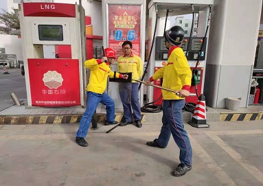 2019年12月13日,為了加強員工安全意識,提高油站防爆反恐應(yīng)急能力,新田加油站組織開展了防爆反恐演練。演練模擬一名手持兇器的嫌疑人突然闖入油站并沖向加油機,拔出加油槍企圖點燃加油槍進行縱火;員工見狀立刻關(guān)閉加油槍開關(guān),安撫歹徒情緒與其周旋,其他員工立即拿起油站的防爆工具前去支援;最后員工合力將歹徒制服帶離現(xiàn)場,油站排除隱患后正常營業(yè)。